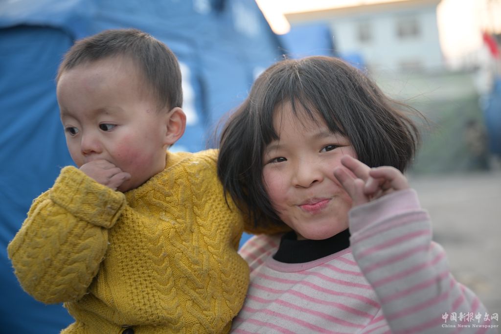 安置點的一對姐弟,姐姐抱著弟弟對著鏡頭比“耶”。攝影:積石山縣融媒體中心李華