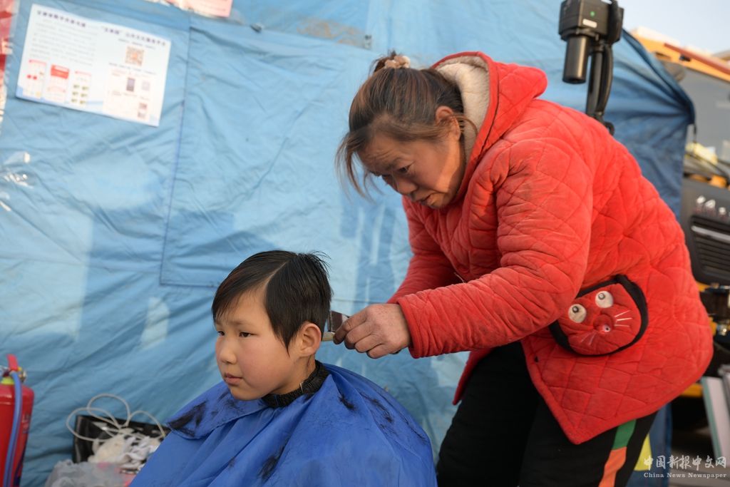 一位聾啞人,盡管不能和周圍的人語言溝通,但她在安置點主動為孩子們免費理發(fā),用自己的手藝給孩子們提供力所能及的幫助和溫暖。攝影:積石山縣融媒體中心李華