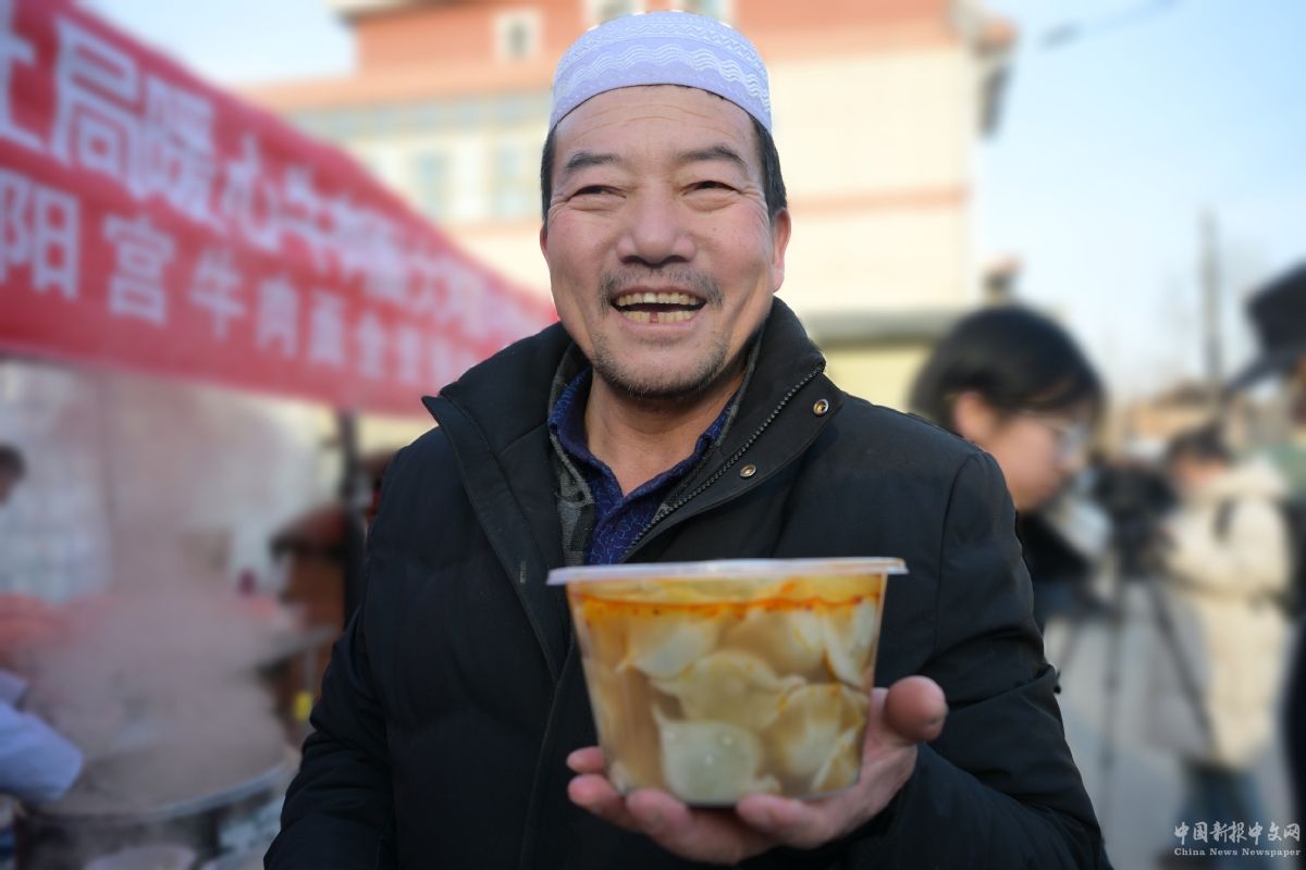 一位大叔接過志愿者為災區(qū)群眾和志愿者煮的冬至餃子,由衷地笑了。攝影:積石山縣融媒體中心李華