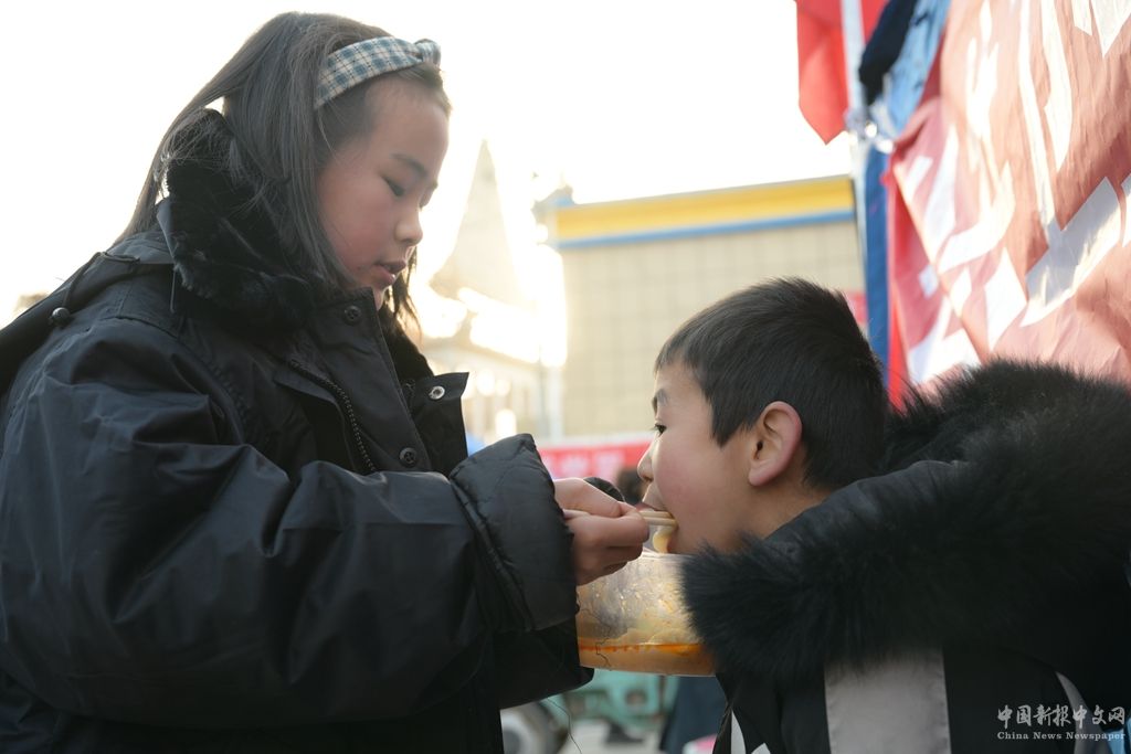 一位年齡稍大的女孩,給身邊一位弟弟喂餃子。攝影:積石山縣融媒體中心李華