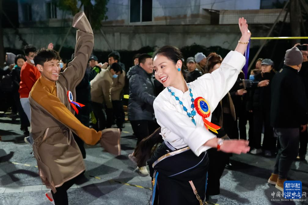 雍吉(前右)和扎西澤仁(前左)在成都錦外中心附近的廣場上領跳鍋莊(12月16日攝)。