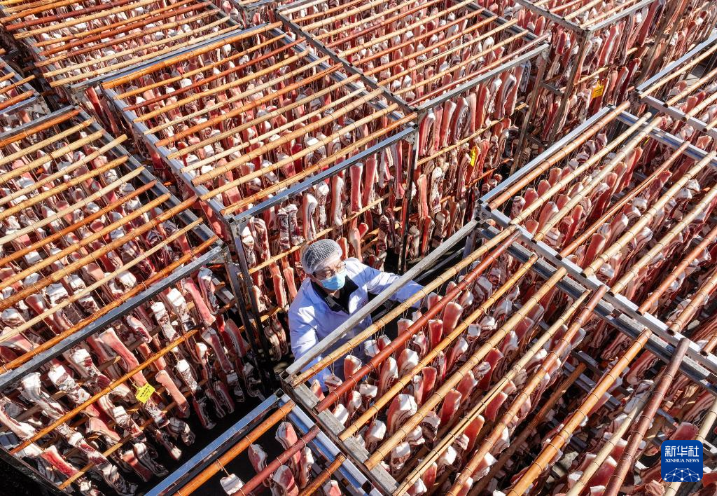 12月26日,安徽省黃山市徽州區(qū)一家食品加工企業(yè)的工人在晾曬臘味。