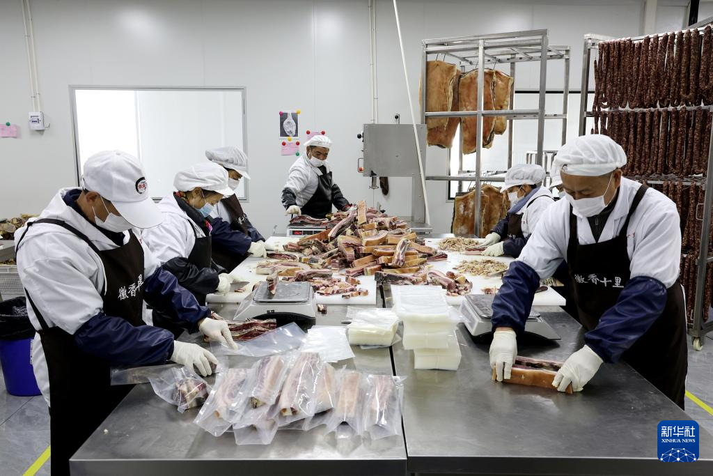 12月26日,安徽省黃山市徽州區(qū)一家食品加工企業(yè)的工人在加工制作臘味產(chǎn)品。