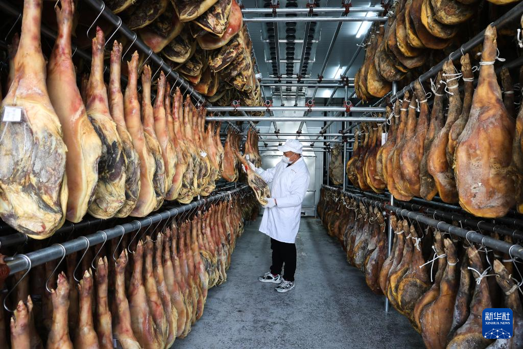 12月26日,安徽省黃山市徽州區(qū)一家食品加工企業(yè)工人在可控溫控濕車(chē)間查看臘味發(fā)酵情況。