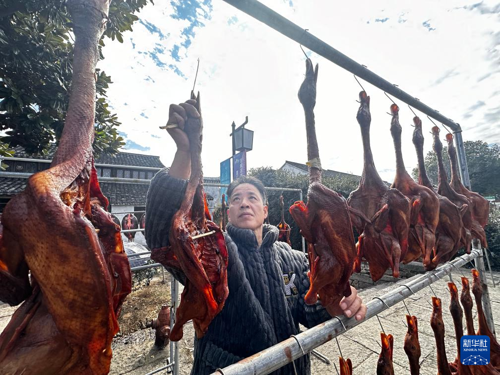 12月26日,浙江省紹興市上虞區(qū)豐惠古鎮(zhèn)一名醬貨店主在晾曬醬鴨。