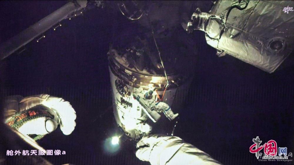 2月9日,神舟十五號(hào)乘組正在執(zhí)行出艙任務(wù)。此時(shí),空間站組合體正通過地球的陰影區(qū)。這是費(fèi)俊龍的航天服頭盔攝像機(jī)拍攝到的畫面。在費(fèi)俊龍視角下,張陸正游走在返回氣閘艙的路上。中國(guó)網(wǎng) 楊佳翻拍自大屏幕