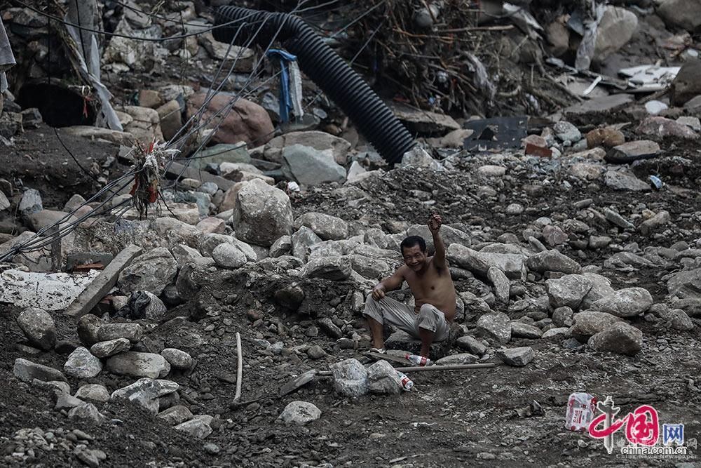 8月3日,北京暴雨過后,一名門頭溝災(zāi)區(qū)的居民在廢墟上向記者招手。中國(guó)網(wǎng) 鄭亮攝影