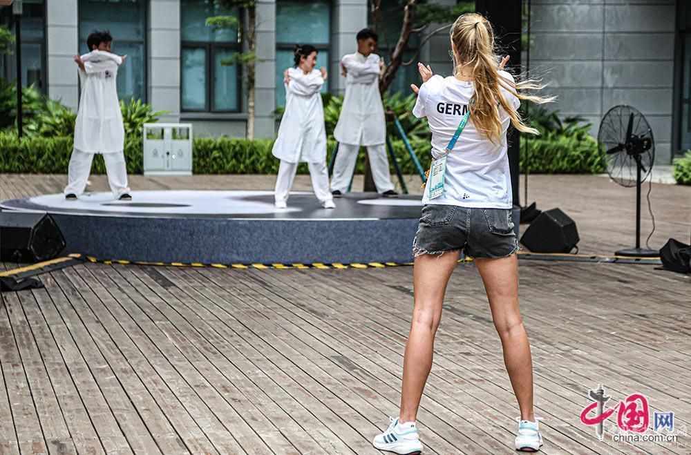 8月3日,在成都大運(yùn)會(huì)大運(yùn)村,一名德國(guó)運(yùn)動(dòng)員正在學(xué)習(xí)太極,長(zhǎng)發(fā)被風(fēng)吹起似“俠女”。中國(guó)網(wǎng) 倫曉璇攝影