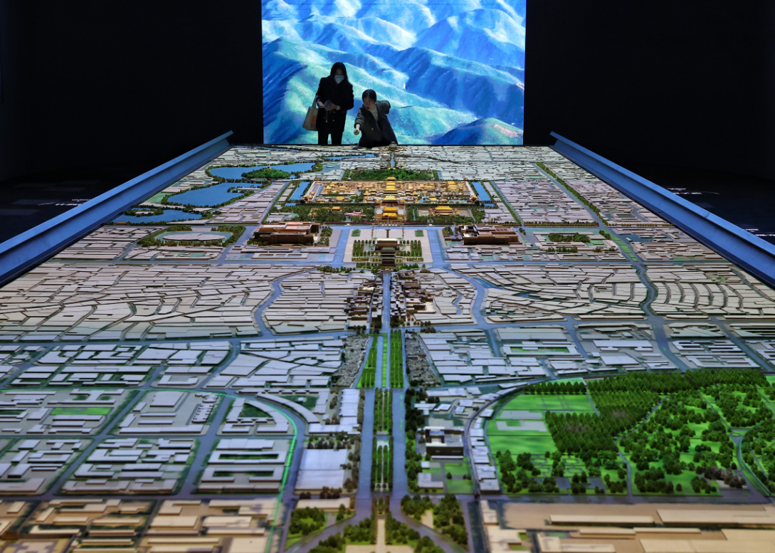 3月27日,嘉賓在媒體預(yù)展上欣賞16米長的中軸線沙盤。中國日報記者 姜東 攝