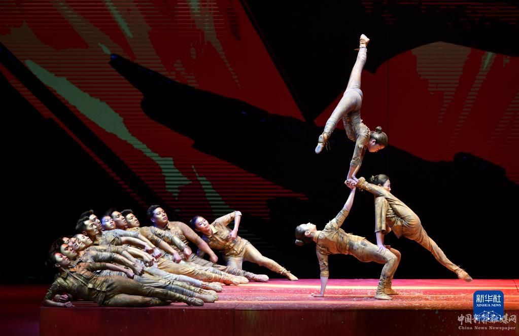 3月28日,在位于山東省濟(jì)南市的山東省會(huì)大劇院,演員表演雜技節(jié)目《豐碑》。