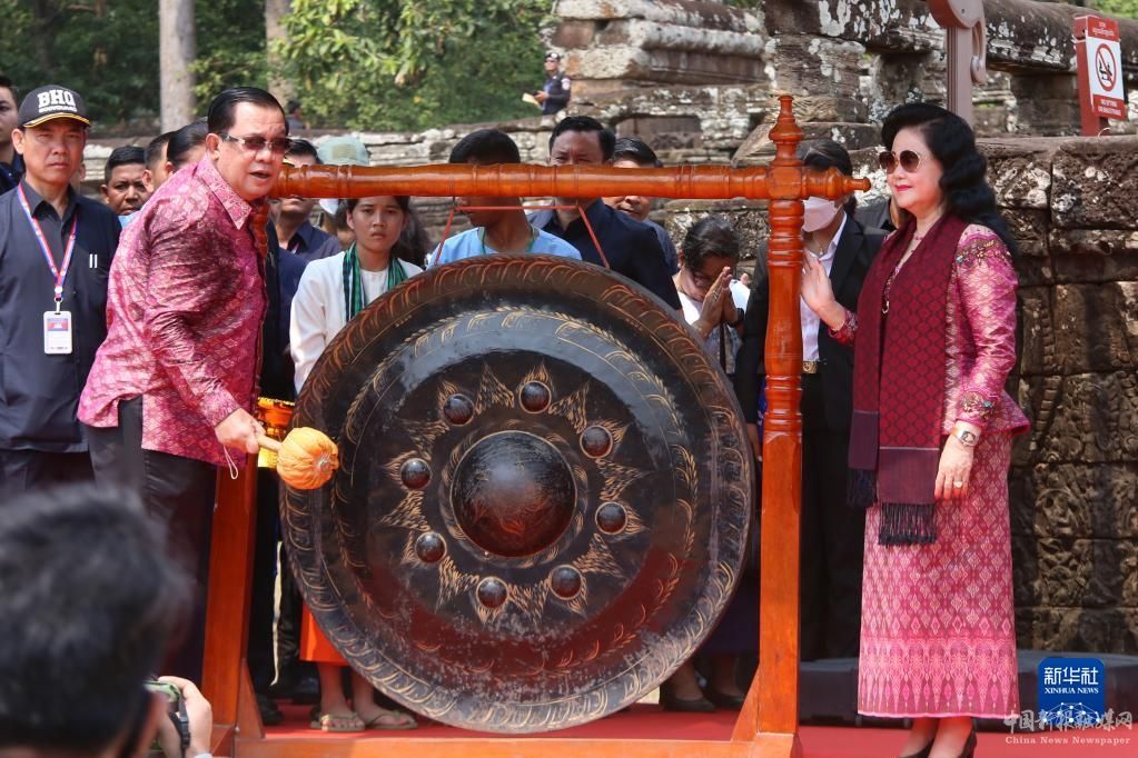 4月14日,在柬埔寨暹粒吳哥古跡內(nèi),柬埔寨首相洪森(左)在宋干節(jié)慶?;顒?dòng)開幕式上敲鑼。
