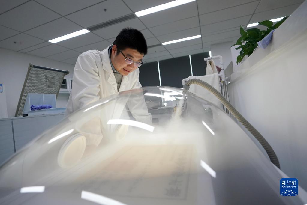 4月28日,在上海市檔案館的保護(hù)技術(shù)部,檔案修復(fù)師任翹楚利用專(zhuān)業(yè)設(shè)備對(duì)檔案進(jìn)行展平處理。