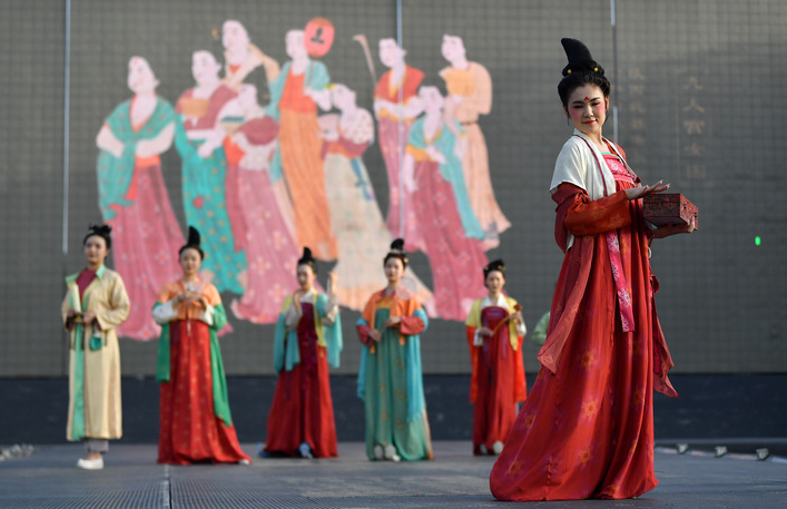 “這次走秀我們集中展示漢、唐、宋、明各色傳統(tǒng)服飾,以華服之美回望千年文明。漢衣雍容古樸,唐裝華麗多彩,宋服素雅柔和,明裝精致優(yōu)雅,都展現(xiàn)了中國傳統(tǒng)文化的精髓和獨(dú)特魅力,引發(fā)游人對文化自信的共鳴。”陜西服裝工程學(xué)院服裝表演專業(yè)老師賀京霞說。