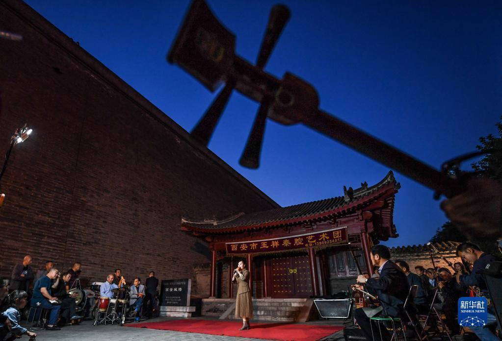2023年5月12日,西安市玉祥秦腔藝術(shù)團成員在西安城墻玉祥門外表演秦腔。