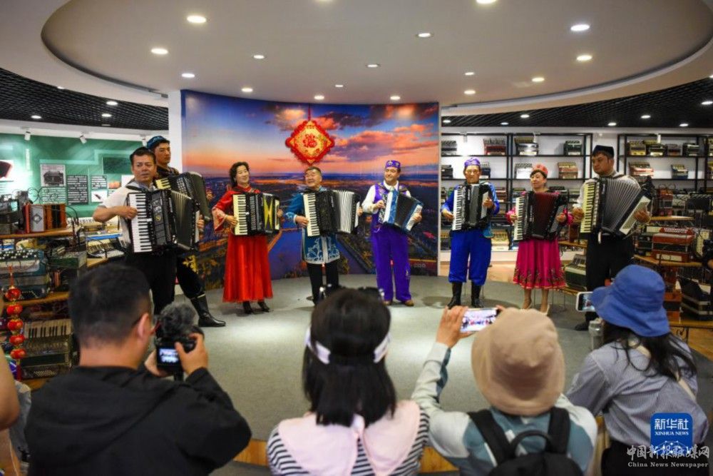 在伊寧市六星街,游客在亞歷山大手風(fēng)琴珍藏館欣賞多民族手風(fēng)琴樂隊(duì)的表演(5月19日攝)。