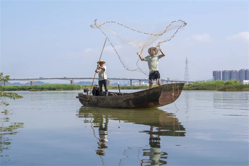 ▲伴隨著悠揚(yáng)的咸水歌,竹排村的漁民在西江上撒網(wǎng)捕魚。(朱永俊 攝)