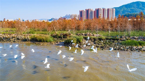 ▲展翅的白鷺與茂密的紅水杉在西江沿岸相得益彰。(朱永俊 攝)