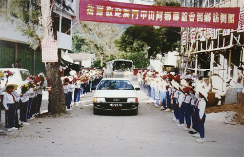 ▲1991年5月,澳門中山同鄉(xiāng)聯(lián)誼會組團(tuán)回鄉(xiāng)訪問,途經(jīng)神灣沙崗村口受到家鄉(xiāng)人民的歡迎。