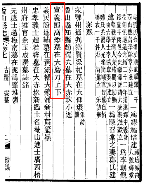 ▲“民國”十二年《香山縣志續(xù)編》關(guān)于宣義郎高添墓的記載。