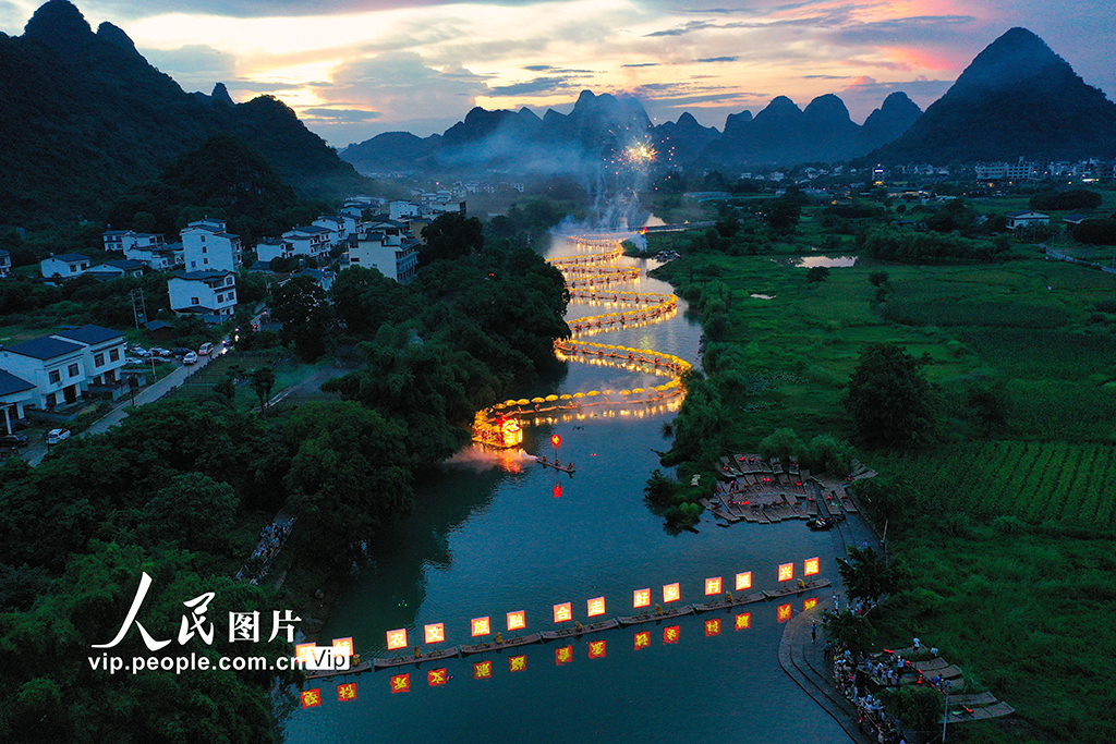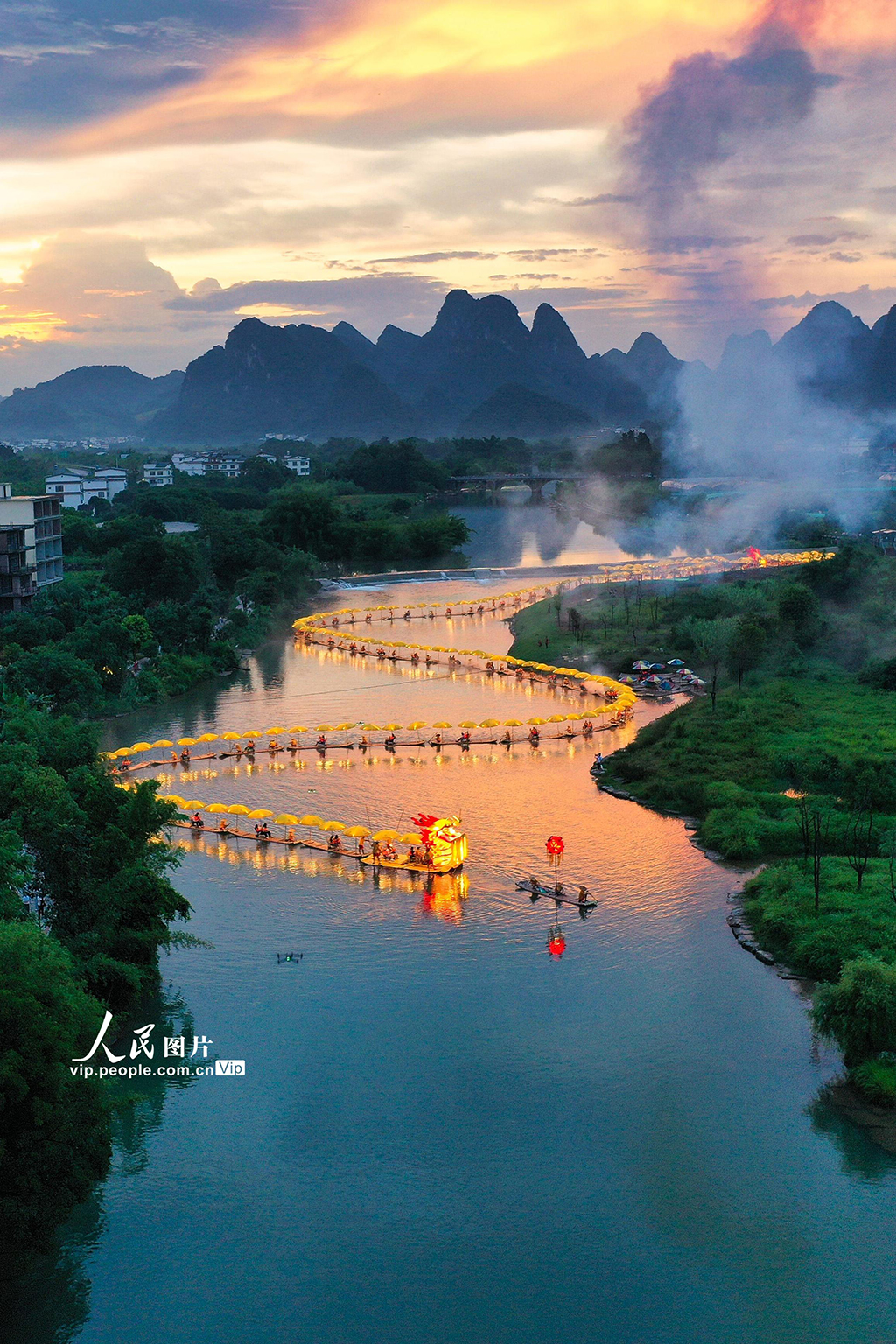 2023年6月18日晚,廣西桂林市陽朔縣白沙鎮(zhèn)遇龍村遇龍河上,一條由55張竹筏組成的550米長的金色“巨龍”巡游,與秀美的山水交相輝映,蔚為壯觀。李忠波攝(人民圖片網(wǎng))