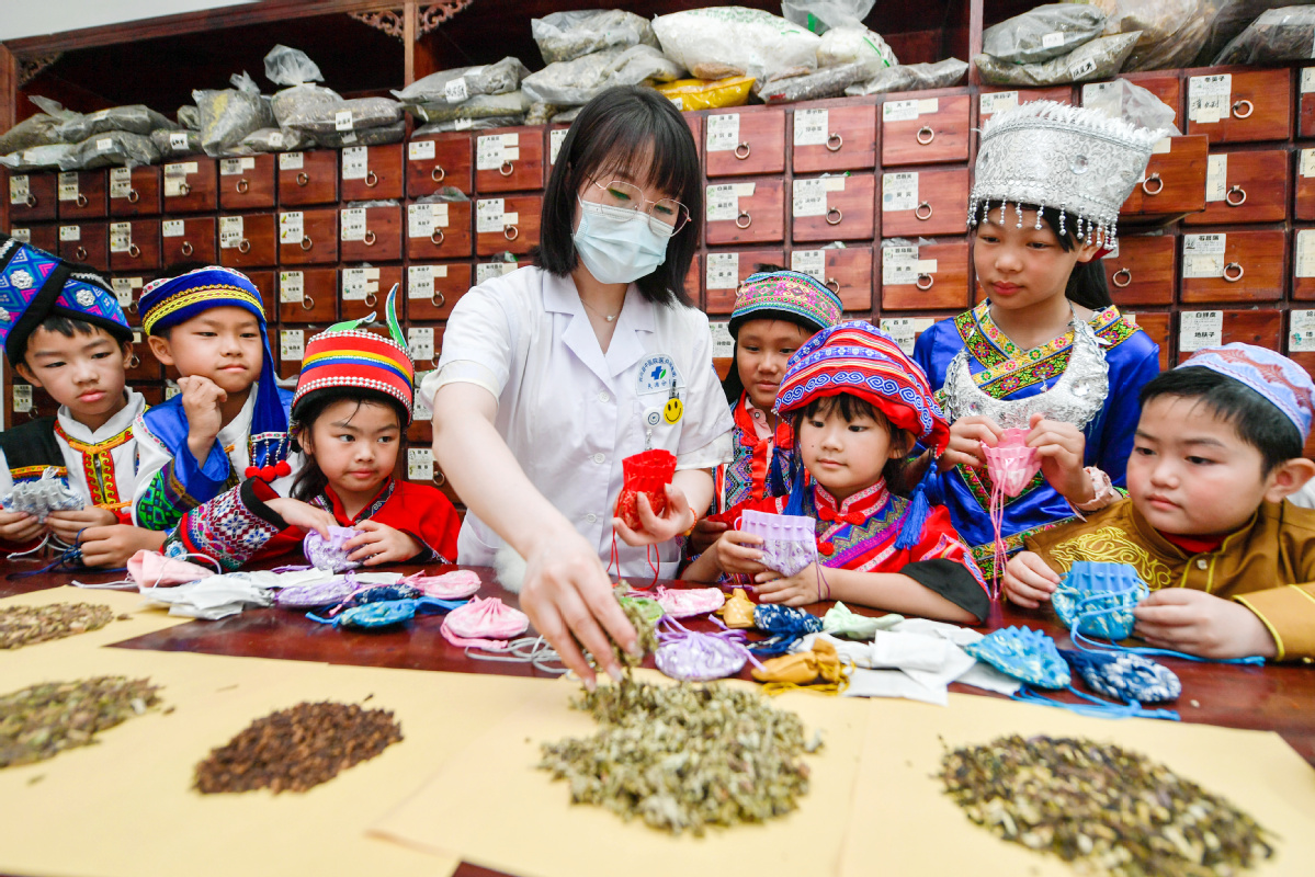 6月20日,浙江省湖州市長興縣夾浦鎮(zhèn)衛(wèi)生院中藥房,藥師指導該鎮(zhèn)中心小學的少數民族孩子制作傳統中藥香囊。譚云俸 攝