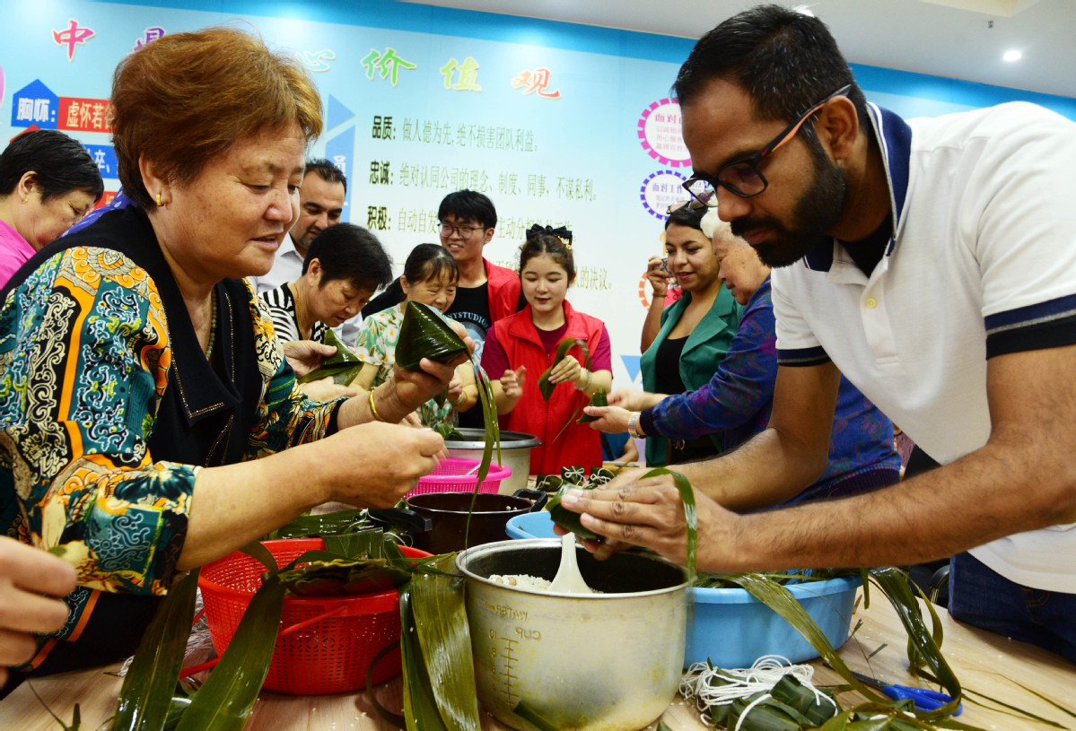 6月19日,江蘇省鎮(zhèn)江市遠洋社區(qū),江蘇大學的中外大學生和居民一起包粽子。石玉成 攝