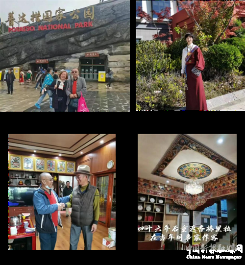 短短的五天時間,重返曾經(jīng)放馬的牧場(普達措國家公園),朝拜了當時毀于一旦,如今金碧輝煌的小布達拉宮——噶丹松贊林寺;夜游了獨克宗古城。特別是受到迪利和張之信老同事家的熱情款待。當我步入他們?nèi)龢且坏撞厥叫路孔樱匆娫簝?nèi)陽臺和日光棚里栽滿鮮花、綠草時,讓我憶起當年無樹無花無草的“土氈房”。房間一間間如星級旅社一樣,潔白干凈,特別是關(guān)注到已有了夫妻房間……,我們在布置如宮殿一樣的客廳里,接受了告別過去火堂,而如今金屬做的爐灶(也有電爐)打出的香噴噴的酥油茶。還參觀迪利在三樓設(shè)置的拜堂,八十二歲的他每天要“五體投地”拜佛七、八十次,這是他的信仰,也是如今八十二歲他仍然十分硬朗的原因之一。他們還講到,如今共產(chǎn)黨好,每月還給八、九千甚至一萬以上工資……,回憶當時他們只有22.5元的工錢。對比當年,看見他們的笑容,我心滿意足和放心踏實了!