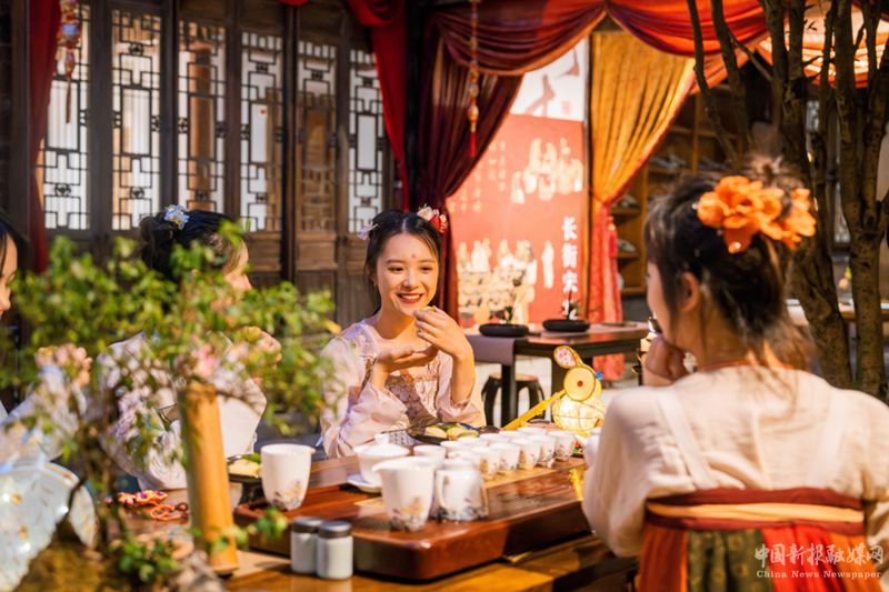 水巷游船連結(jié)歷史與新潮,棋盤街道則連結(jié)文化與生活。在"歷史街區(qū)再利用"的理念之下,濮院時尚古鎮(zhèn)內(nèi)的許多場景實現(xiàn)了有機更新,激發(fā)宋韻"血脈",讓宋式文化生活穿越千年重回現(xiàn)代。老街兩側(cè)的宋代建筑群,飛檐斗拱盡顯江南風情,讓禪意呼之欲出;焚香、點茶、掛畫、插畫,以"宋人四藝"為媒,景區(qū)內(nèi)的雅致體驗層出不窮?;顒悠陂g,景區(qū)內(nèi)的寺灣街更重現(xiàn)宋時繁華之景,"長街宋宴"煥發(fā)宋韻風雅,市井攤位聚攏濃濃煙火氣,游客可于此品濮糕,聞古音,賞演繹,感受歷史與時代交相輝映的別樣圖景。