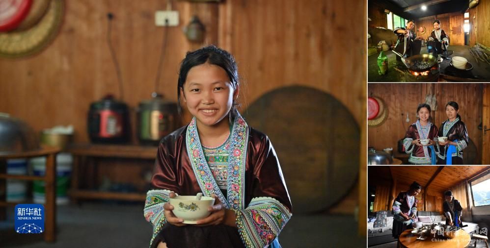 拼版照片:左圖為廣西融水苗族自治縣桿洞鄉(xiāng)堯告村11歲的小學生韋雪菲;右圖為韋雪菲跟著媽媽學習打油茶(照片均攝于7月6日)。韋雪菲說,以前都是媽媽打油茶給她喝,這個暑假她一定要學會打油茶,然后打給媽媽喝。