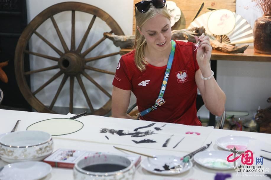來自阿塞拜疆的運(yùn)動(dòng)員Lamiya Valiyeva小心翼翼地在團(tuán)扇上完成了自己的國畫作品。因?yàn)橛兄欢ǖ睦L畫基礎(chǔ),她的作品還得到了老師的夸獎(jiǎng),這也讓她十分開心。Lamiya Valiyeva是一名不折不扣的李小龍粉絲,她興奮地向記者展示著自己手機(jī)中的李小龍壁紙。在完成一幅國畫作品之后,Lamiya Valiyeva也對(duì)中國傳統(tǒng)藝術(shù)有了自己的切身感受:“中國的繪畫藝術(shù)非常不同,在完成作品時(shí),我不需要用力去描繪,要輕輕地、溫柔地去繪畫,這是一種完全不同的表現(xiàn)形式。”