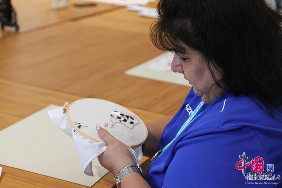 一名運(yùn)動(dòng)員體驗(yàn)蜀繡,并繡下自己和丈夫的中文名字。中國網(wǎng)記者 倫曉璇 攝