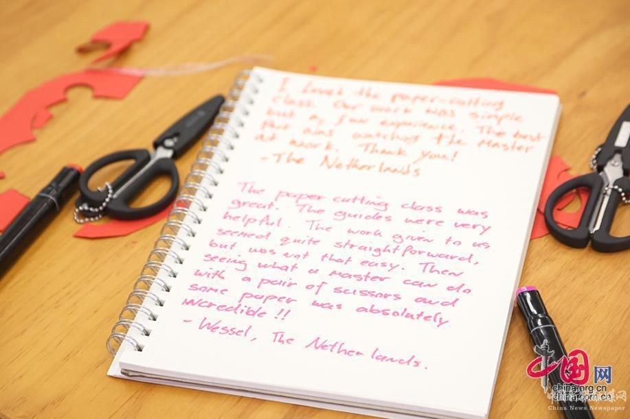 在剪紙?bào)w驗(yàn)區(qū),荷蘭運(yùn)動(dòng)員Wessel Hesselink收獲了一枚來自彭州市非物質(zhì)文化遺產(chǎn)剪紙傳承人莊從燦為他剪制的側(cè)臉輪廓作品,并在莊從燦的指導(dǎo)下體驗(yàn)了一把剪紙藝術(shù)。體驗(yàn)過后,Wessel Hesselink在留言本上認(rèn)認(rèn)真真寫下了自己的心得:“老師給我們的任務(wù)似乎不復(fù)雜,但(對(duì)我來說)也沒有那么容易,老師僅用一把剪刀和普通的一張紙便剪出作品,真的令人難以置信”。