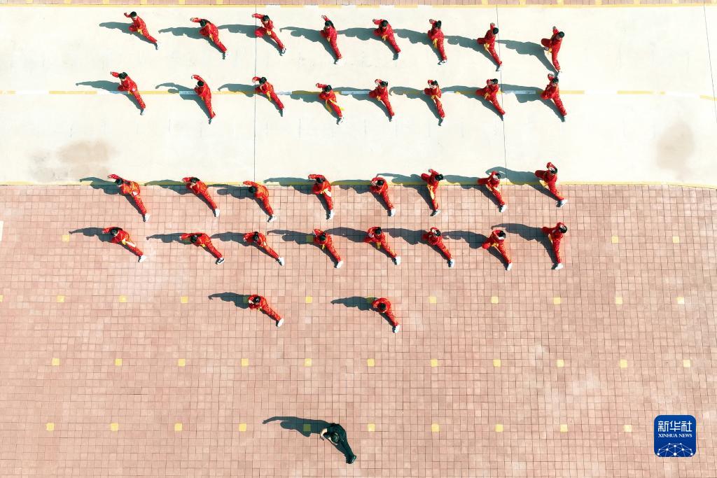 8月14日,在河北省滄州市滄縣汪家鋪鎮(zhèn)董辛莊小學(xué),老師帶領(lǐng)學(xué)生習(xí)練武術(shù)(無(wú)人機(jī)照片)。