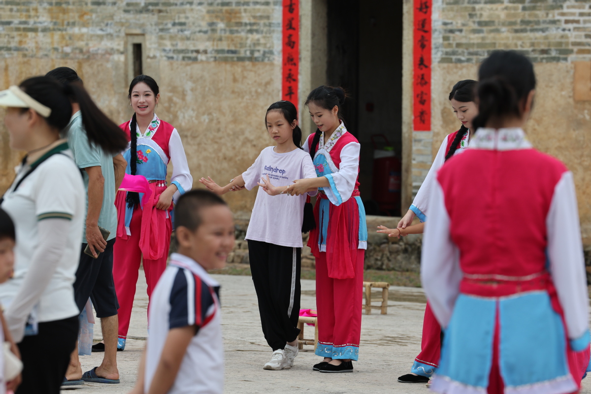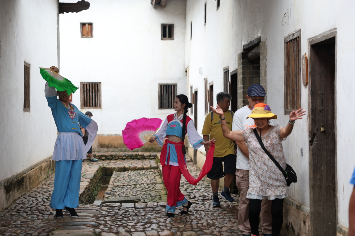 8月15日,安遠(yuǎn)縣劇團(tuán)的演員向游客教授采茶戲,讓游客沉浸式體驗(yàn)贛南文化。中國日報(bào)記者 馮永斌 攝