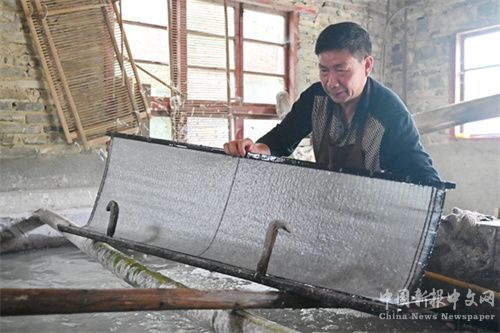 8月15日,湖南省非物質(zhì)文化遺產(chǎn)傳承人、隆回縣麻塘山鄉(xiāng)八角樓村手工藝人伍先容在抄雪花皮紙。 生產(chǎn)雪花皮紙是八角樓村代代相傳的手藝,相傳從清代乾隆年間開始盛行,一直傳承到今天。