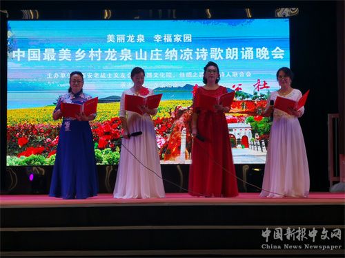 采風(fēng)團(tuán)成員與龍泉山莊商戶和龍?jiān)创迕?,?月14日當(dāng)晚聯(lián)袂舉辦了“美麗龍泉,幸福家園”消夏納涼詩歌朗誦晚會(huì),以鼓舞、詩誦、舞蹈、歌唱等形式贊美謳歌龍泉山莊,著名軍旅書法家田繼光代表老戰(zhàn)友文友會(huì)向劉煒董事長(zhǎng)贈(zèng)送了四條屏?xí)ā侗P龍柳茶賦》(王芳聞撰賦),村民約二百多人參加了晚會(huì)。