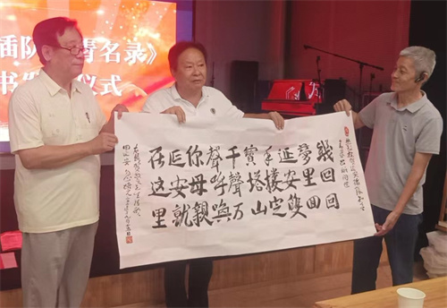 最后,忽培元參事在會上奉獻 展示了長幅墨寶“青春長歌,天地可鑒” 和“賀敬之詩作”,并傾情賀詩一首: