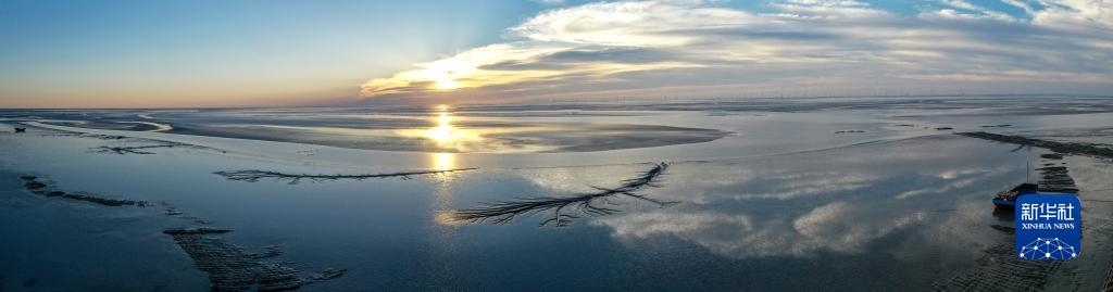 晨曦下的鹽城東臺(tái)條子泥濕地(2023年9月1日攝,無(wú)人機(jī)照片)。