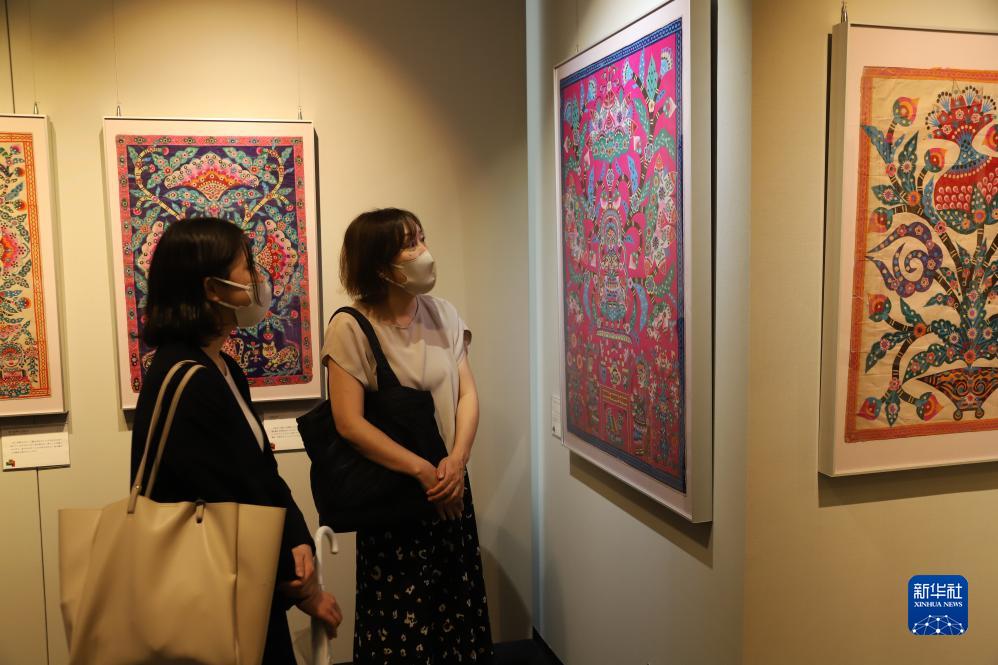 9月21日,人們?cè)谌毡緰|京舉行的庫(kù)淑蘭剪紙藝術(shù)展預(yù)展上觀看剪紙作品。