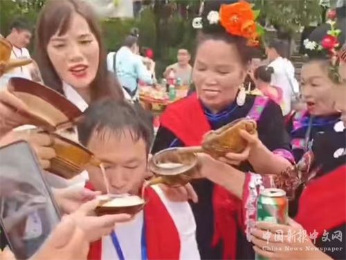 前來參加蘆笙會(huì)的黔東南同鄉(xiāng),按照家鄉(xiāng)活動(dòng)的標(biāo)準(zhǔn),帶來了糍粑、雞鴨、稻谷、布匹等禮物。組委會(huì)在進(jìn)場通道上設(shè)置了多道攔門酒,凡進(jìn)場來賓,除了孩童和駕駛員,均喝酒通過,以這樣的方式,迎接從各地趕來的同鄉(xiāng)……如此一來,活動(dòng)現(xiàn)場熱鬧非凡,洋溢著節(jié)日的喜慶氣氛。