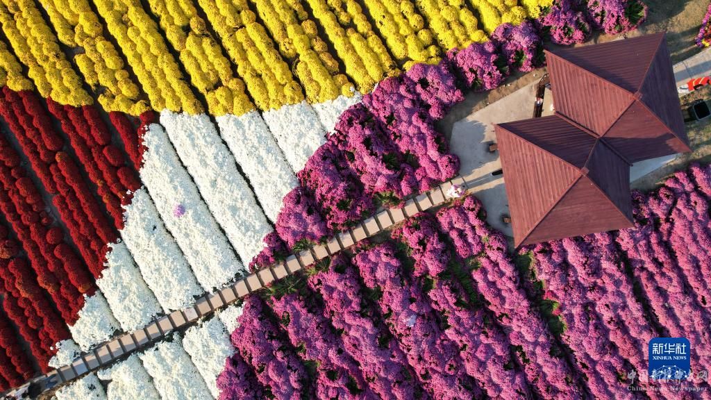 這是10月21日在江蘇射陽縣洋馬鎮(zhèn)拍攝的第二十八屆洋馬菊花節(jié)現(xiàn)場(chǎng)(無人機(jī)照片)。