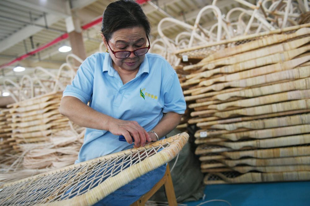 工作人員在位于漢中市的陜西良順匠心實業(yè)有限公司編織藤制品(2023年9月7日攝)。新華社記者 張曼怡 攝