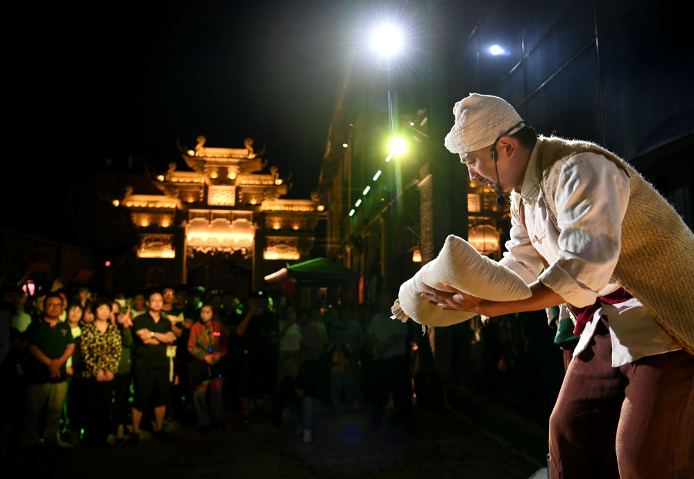 游客在長安十二時辰主題街區(qū)觀看唐風(fēng)演藝《將進酒》(2023年8月2日攝)。新華社記者 鄒競一 攝