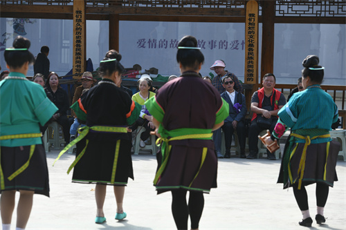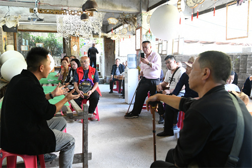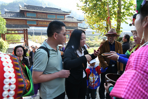 2023年10月18日,貴州省凱里市舟溪鎮(zhèn)曼洞村,殘疾人家庭在青曼苗寨體驗苗族攔門酒。(楊仁海 攝)