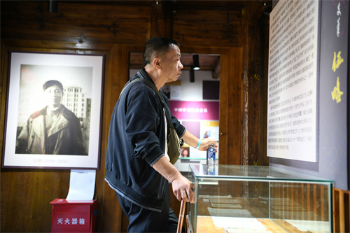 2023年10月18日,貴州省凱里市舟溪鎮(zhèn)曼洞村,一名殘疾人在青曼苗寨參觀伍略先生文學館。(楊仁海 攝)