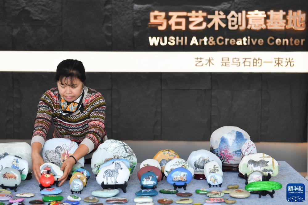 11月8日,在湖南省瀏陽(yáng)市小河鄉(xiāng)烏石村的烏石當(dāng)代藝術(shù)館,農(nóng)民在整理石頭畫。