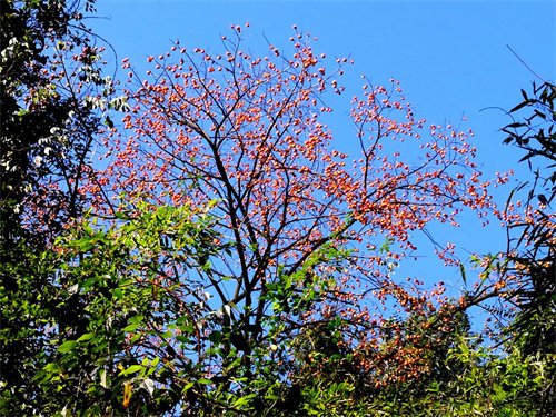 這個秋天,我突然想起了圣安寺所依的楞伽山。同時,這個秋天,也想起了我的恩師寶曇長老。恩師是一位慈悲正見的長老,一生老實做人。因為老實,也挨了不少的整,但也是樂天派,生活總那么自在與樂觀。在這一點上,我老是學不到,總是對一些憤憤不平之事而怒懟。其實,這是一種沒修證好的執(zhí)著心態(tài),不公平的事只是相對而言的。起心動念,皆因因人而異,因事而異罷了。所以說,看破一切,看慣一切才是道。 我剛來重建圣安寺時,有人建議在楞伽山上多種常青樹,而我覺得對山上樹加以保護便可,不需種同一樹種?,F在,事實印證,這個決定還真是保護生態(tài)的遠見。因為這一決定,山上的雜樹就有了機會。秋天的季節(jié),山上雜木野樹上滿是槳果,此時的楞伽山更是成了各種鳥的天堂。山上的槳果,山上這份清凈,人鳥一如,誰愿意過驚濤駭浪或者饑寒交迫的日子呢?無論人也罷,飛禽走獸也罷,住在山上應是很愜意的。山上的野槳果,不僅使得楞伽山充滿了生機,而滿山遍野的秋葉更是讓人賞心悅目。那些紅紅的、黃黃的果實我道不出它的名字,但我還是認識野柿樹的。秋天的野柿樹上,密密麻麻掛滿了小柿子。深秋的柿樹,葉子掉得差不多了,樹上幾乎只剩下紅黃相間的果實,與寶塔一道打卡拍照,吉利而鮮活的場景,讓人過目不忘,銘記心腦。