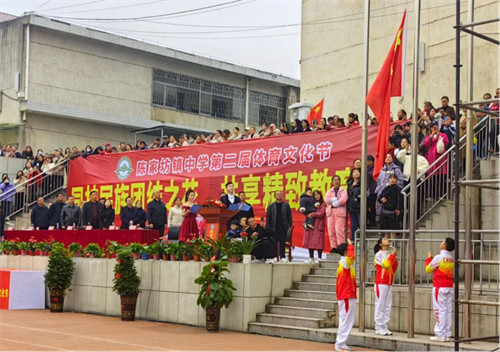 莊嚴(yán)的升旗儀式后,陳家坊鎮(zhèn)中學(xué)校長(zhǎng)石新苗致歡迎詞,他先后介紹了近年來(lái)學(xué)校在各級(jí)領(lǐng)導(dǎo)的關(guān)心與指導(dǎo)下,于民族團(tuán)結(jié)、精致教育、體教融合等方面取得的良好成績(jī),并寄語(yǔ)全校師生通過(guò)本次活動(dòng)深入了解各個(gè)民族的體育文化精粹,弘揚(yáng)民族團(tuán)結(jié)精神,傳遞民族團(tuán)結(jié)正能量。石小毛做重要講話,他表示此次體育文化節(jié)是陳家坊鎮(zhèn)中學(xué)積極踐行民族團(tuán)結(jié)、精致教育的具體舉措,并對(duì)全校師生們?cè)诒敬误w育文化節(jié)的表現(xiàn)提出期待與希望。隨后,羅昕昊宣布:“陳家坊鎮(zhèn)中學(xué)第二屆校園體育文化節(jié)開(kāi)幕!”