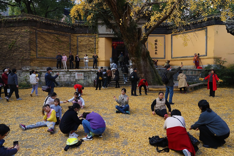 12月9日,惠山寺千年古銀杏樹下,游客拍照打卡。中國日報記者 姜東 攝