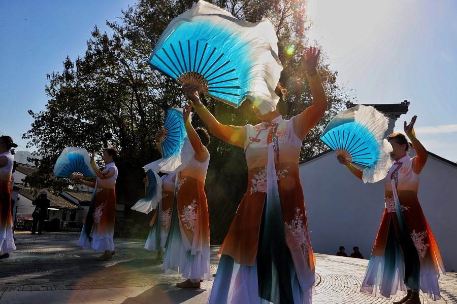 12月8日,古運河畔的清名橋歷史文化街區(qū),舞蹈愛好者表演節(jié)目。中國日報記者 姜東 攝